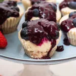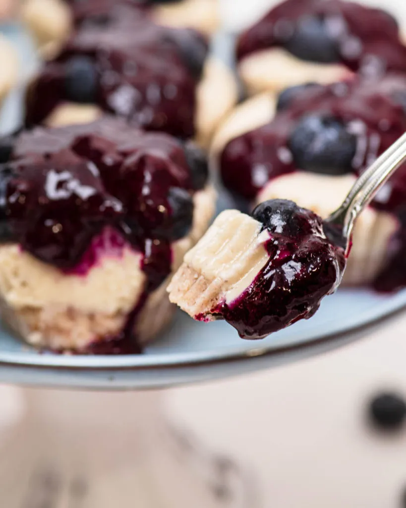Unsweetened coconut cream: Coconut cream is the key to create the cheesecake-like texture. I do not recommend other substitutes. Chill it overnight before using. Raw & unsalted nuts: If the nuts are roasted, they will give the cheesecake an unwanted burning taste. Soak the raw nuts before using (see details in the above session ‘WHY SOAK THE NUTS BEFOREHAND?’) Macadamia nuts are low in carb while cashews give the rich flavor to the cheesecake. You may use other low carb nuts but they may give your cheesecakes a darker color. Vanilla-flavor vegan protein powder: It makes the cheesecake bite a protein snack. Nutritional yeast: It resembles the flavor of cheese as well as adding protein and other nutrition to our cheesecakes. Powdered erythritol: Like for the crust, you can replace erythritol with monk fruit sweetener. Lemon juice: It brings subtle sourness to the cake like cheese. White vinegar would work too. Blueberries: Omit them if you want the cheesecakes lower in carb. For other choices, raspberries, blackberries and strawberries would work.