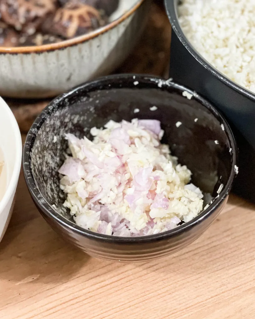 - Process the garlic cloves and shallots to the size of rice or smaller.