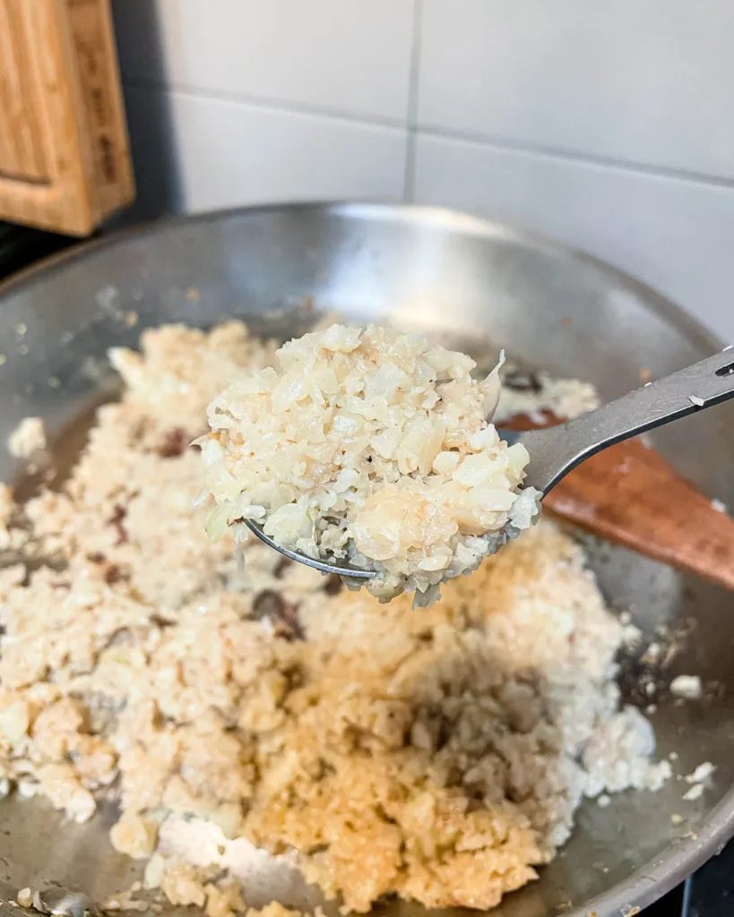 - Heat a tablespoon of olive oil in a large frying pan (about 12” diameter) over medium high heat. Sauté a batch of garlic and shallots until fragrant, then turn to high heat and add the cauliflower rice to stir fry until it turns pale yellow, for about 3 minutes.