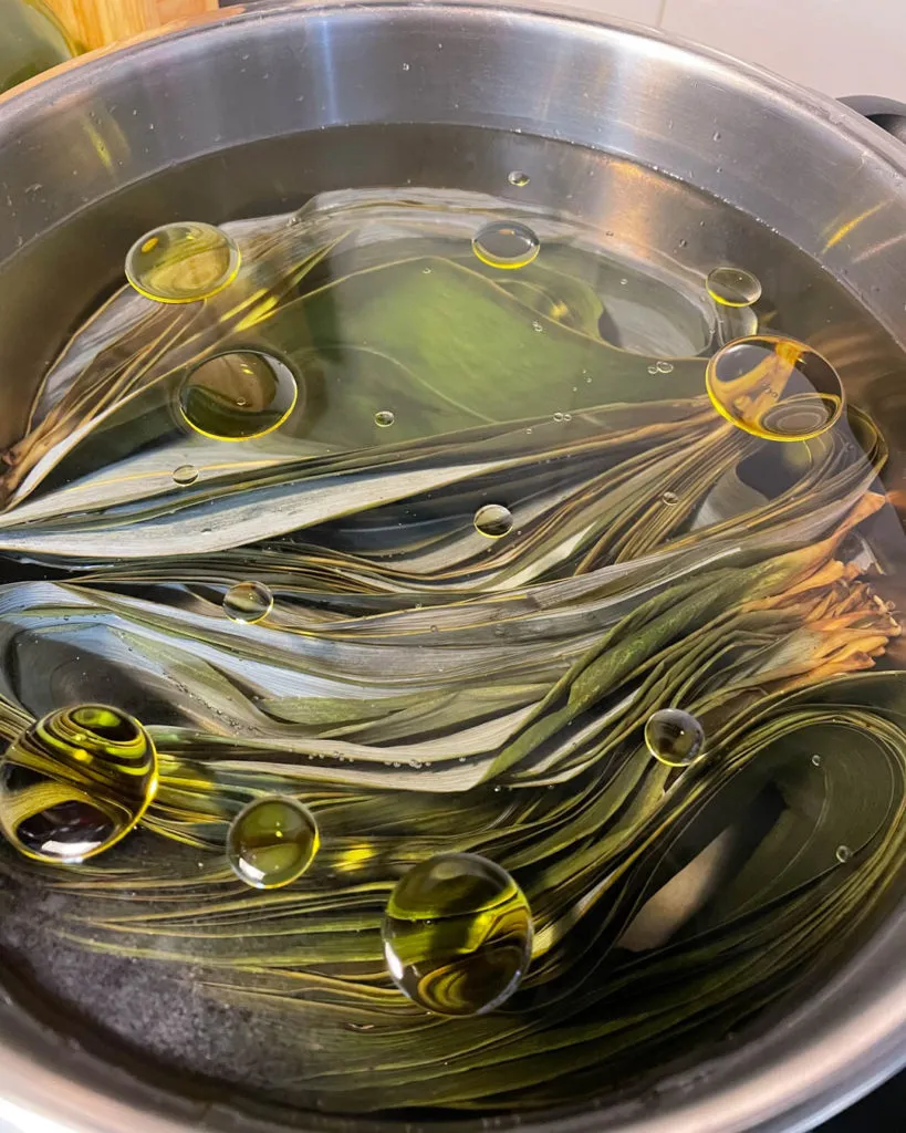 Put on the pot lid and heat the pot of leaves over high heat until it boils, then turn off the heat immediately. Keep the lid on and let the leaves soak overnight or until the water is warm enough to touch (if you don’t have enough time).