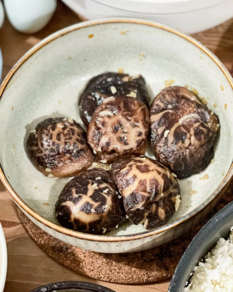 - Cut and discard the stems. In a medium heat proof bowl stir together olive oil, keto soy sauce, minced garlic and monk fruit sweetener to make sauce, then put the shiitake mushrooms in and massage them with the sauce.
