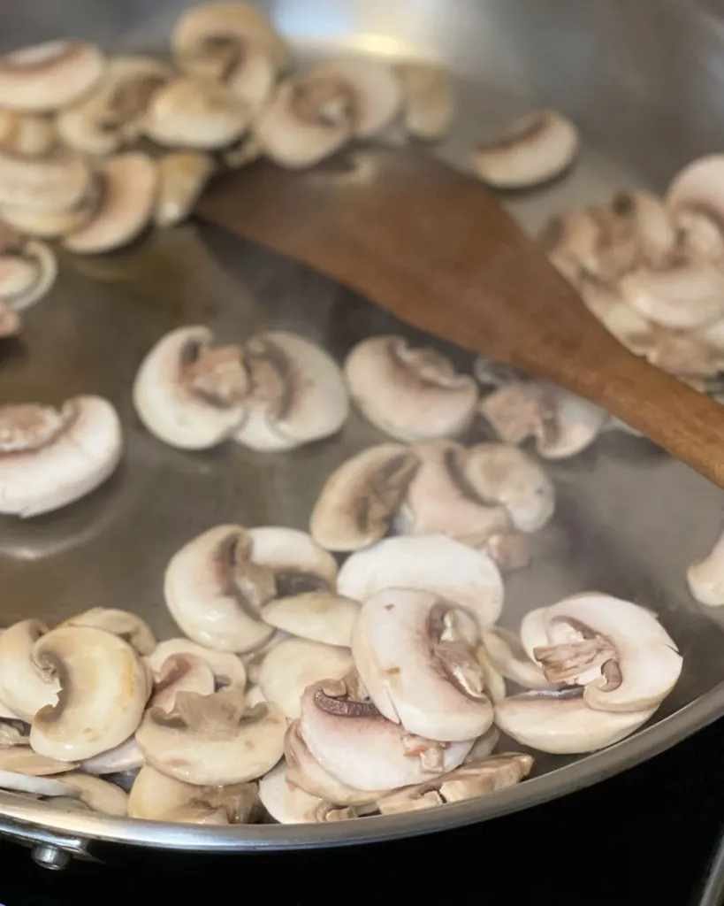 - In a frying pan, heat a tablespoon of olive oil over medium heat, sauté mushroom slices until golden brown and soft, then season with sea salt and five spice powder and stir to combine. Taste and add more seasoning if necessary. Plate up the mushrooms and set aside.