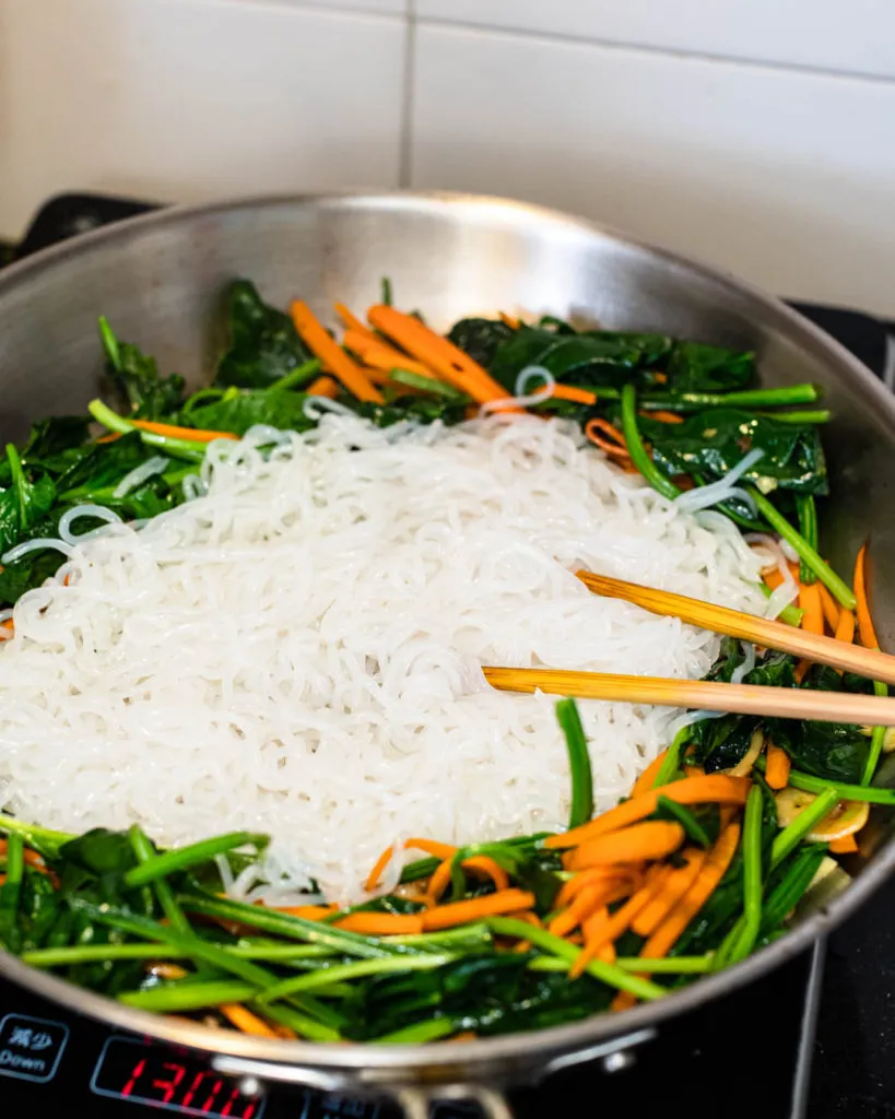 Add spinach to stir fry until it starts to soften but not tender. Push every to one side of the pan and add shirataki noodles to stir fry for about 30 seconds.