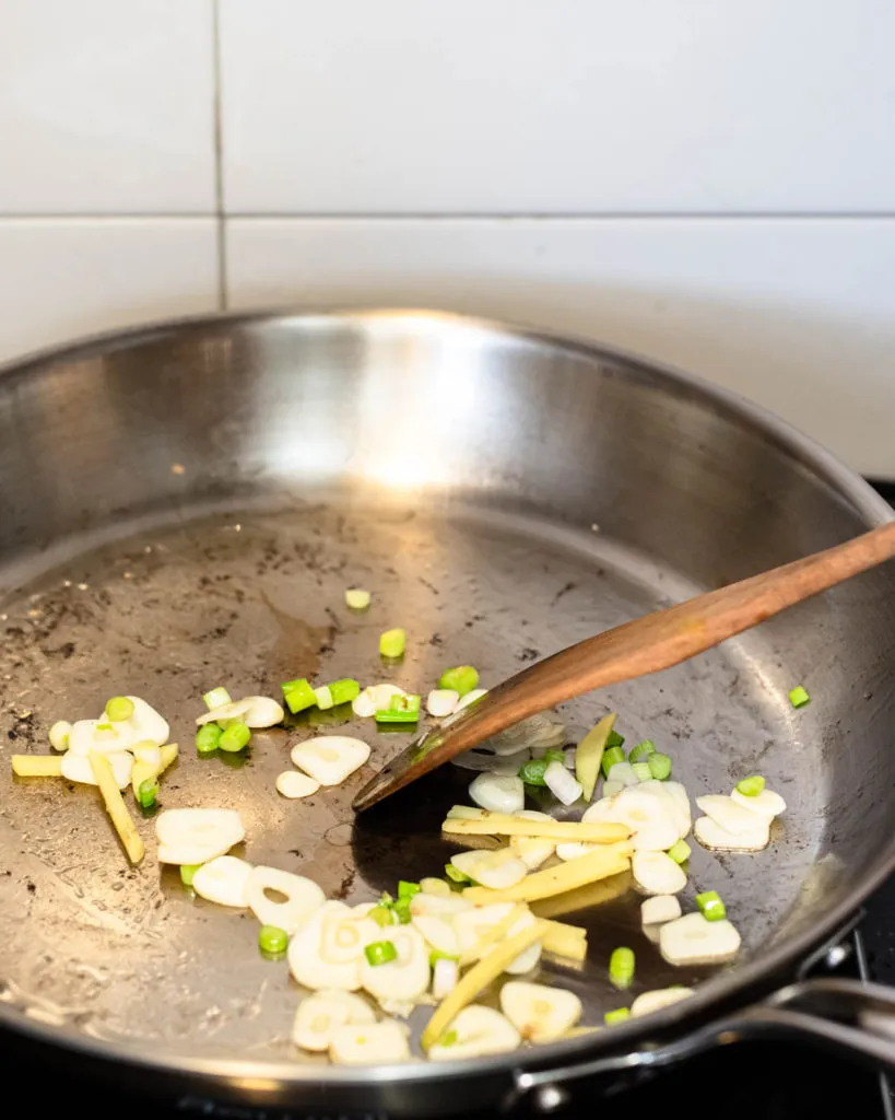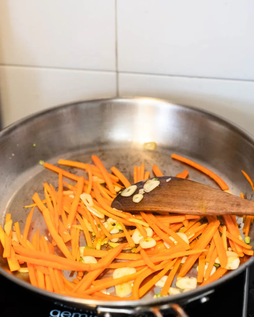 Add a teaspoon of olive oil to sauté garlic, green onion white and ginger until fragrant, then add carrots to stir fry until soft, for about 2-3 minutes.